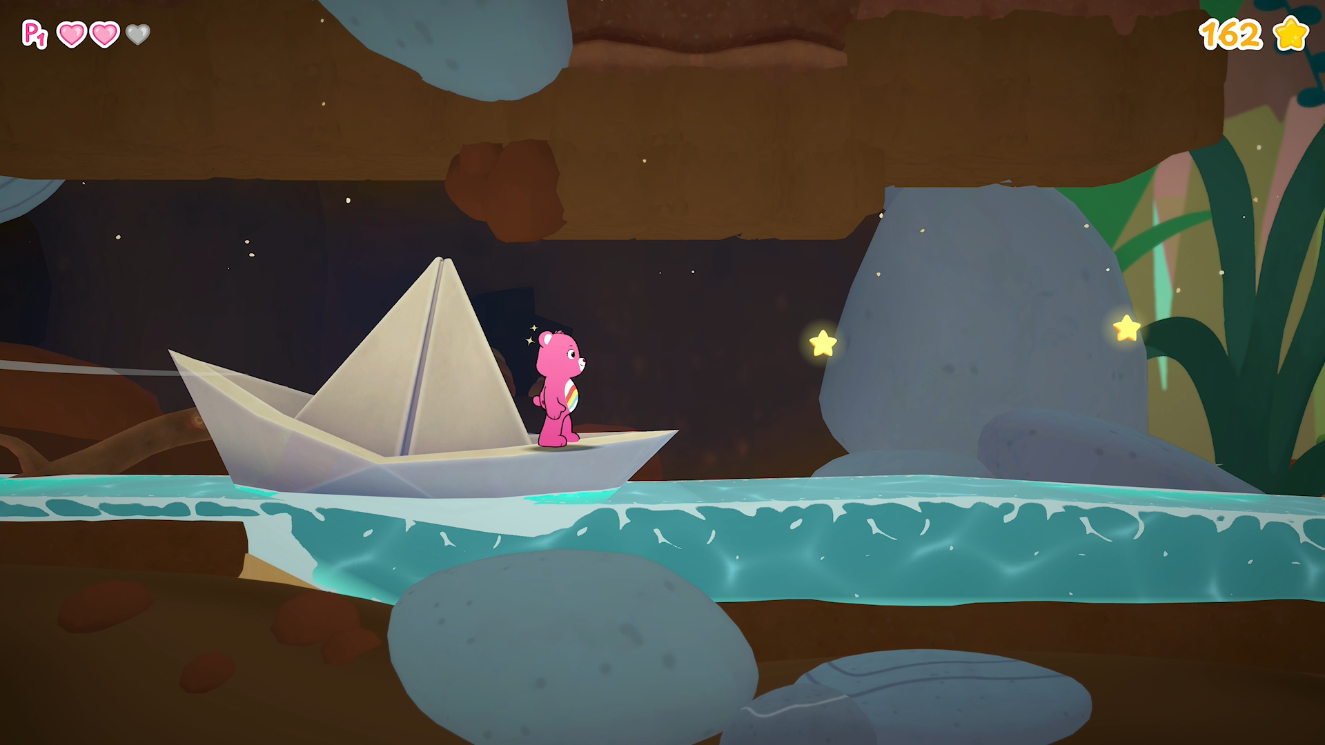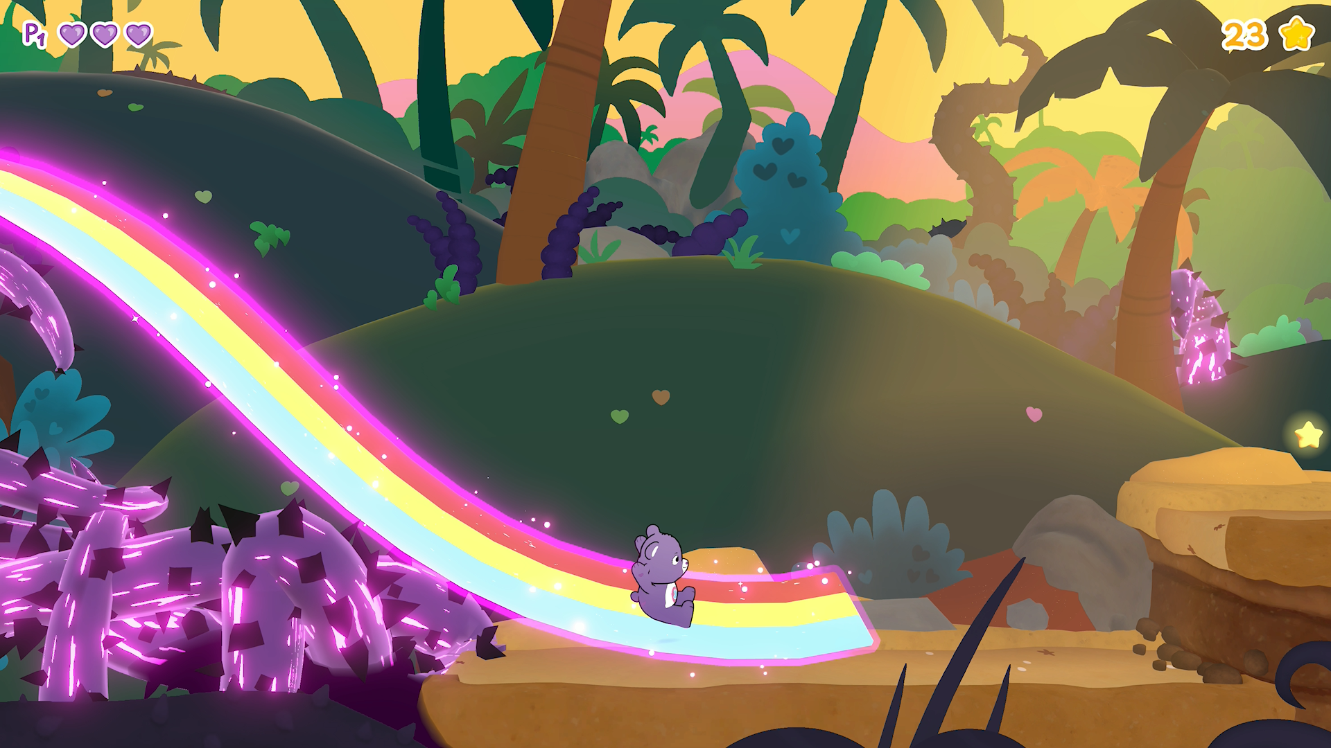À la manière d’un Super Mario Bros., les joueurs ont la possibilité de secourir leurs alliés lorsqu’ils se retrouvent en difficulté, évitant ainsi un retour au point de contrôle précédent. Et pour rester fidèle à l’univers des Bisounours, chaque personnage réapparaît sur un petit nuage après avoir été réanimé… Un joli souci du détail qui renforce l’immersion dans ce monde plein de tendresse !