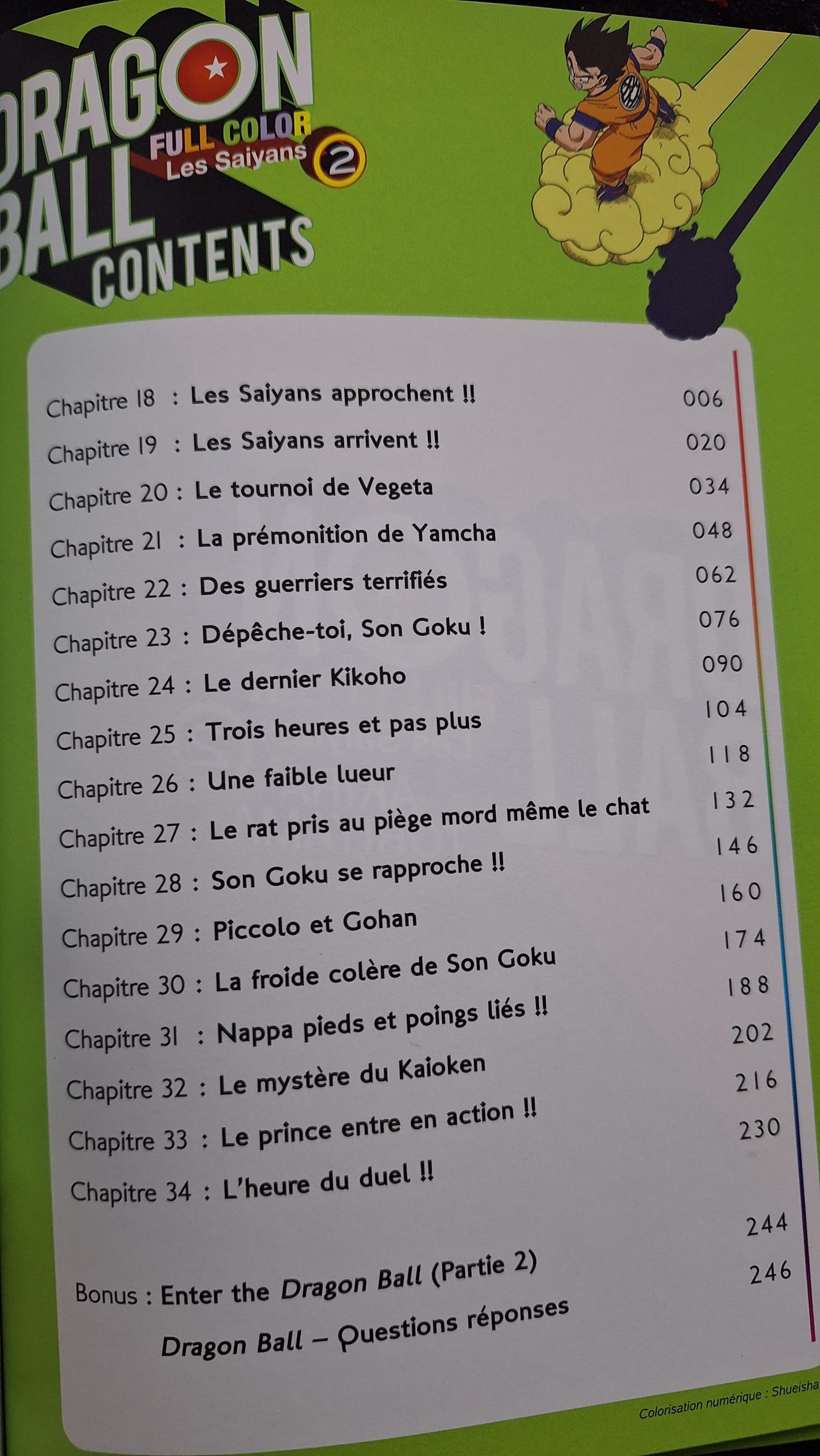 Au total, pas moins de 17 chapitres (du chapitre 18 au 34) composent ce volume. On peut notamment lire Les Saiyans approchent, Les Saiyans arrivent, Dépêche-toi Son Goku, Son Goku se rapproche, Le prince entre en action… avant d’atteindre le dernier chapitre, intitulé L’heure du duel.