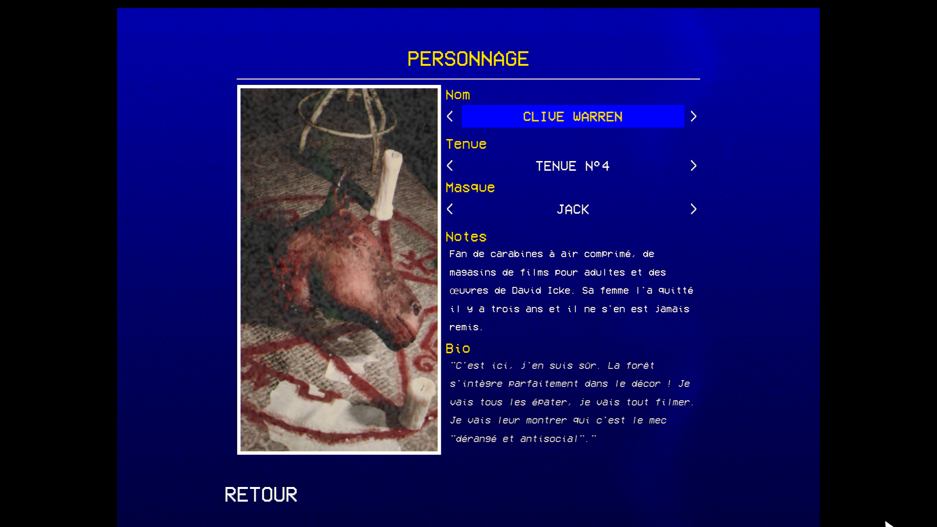 La seconde étape consiste à sélectionner votre survivant. Ce choix n’a pas d’impact sur le gameplay : il s’agit principalement d’un aspect esthétique. Vous avez accès à un total de neuf survivants, chacun disposant de quatre tenues différentes (la couleur change, mais pas le style).