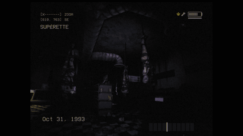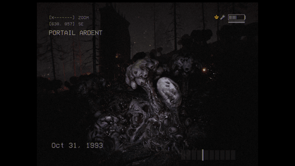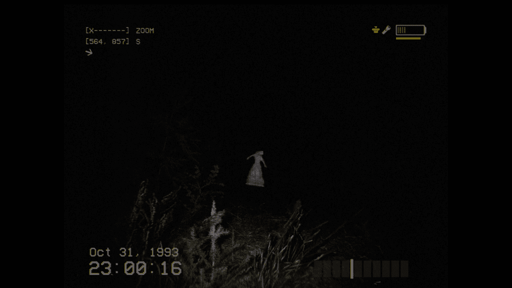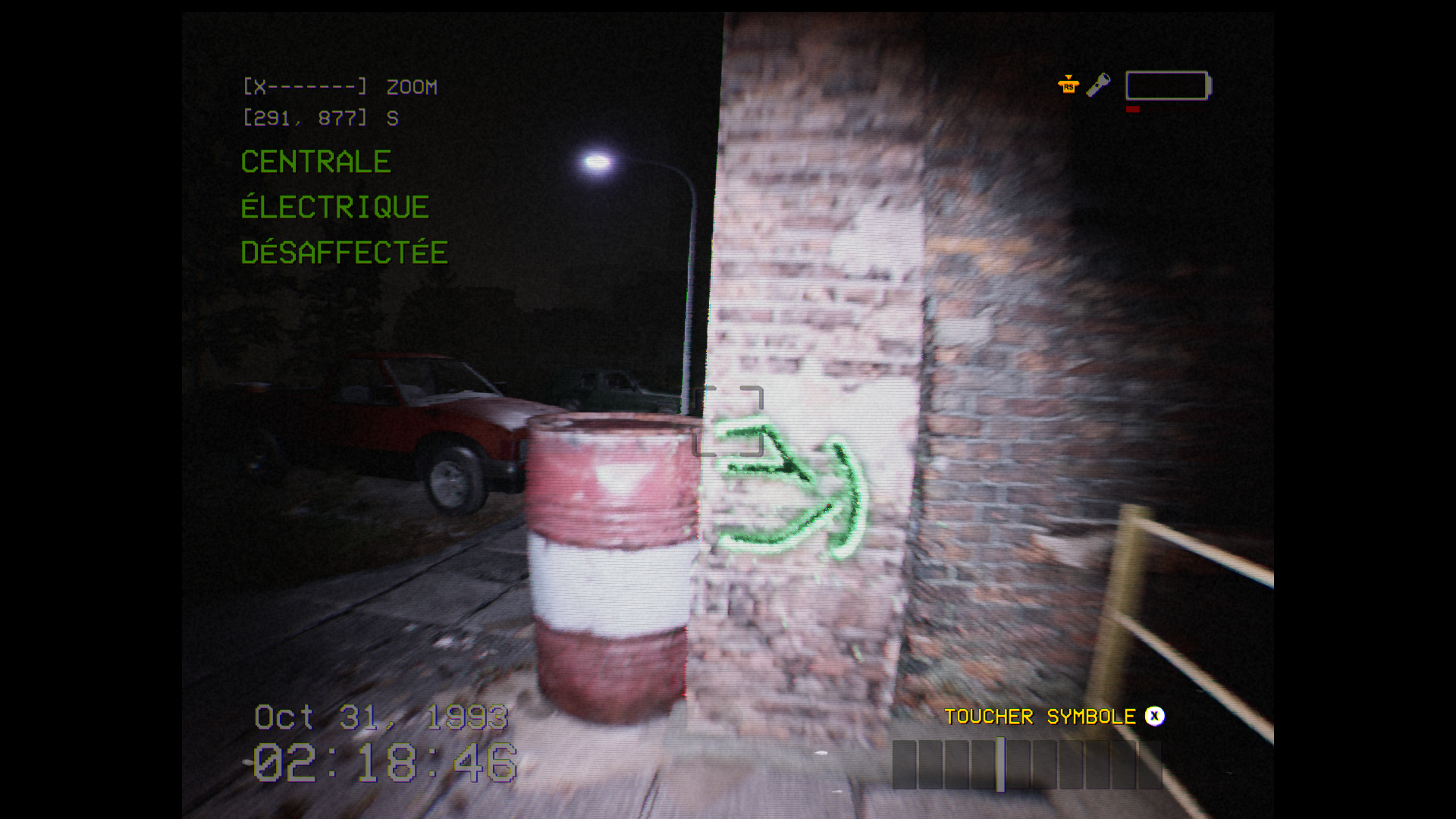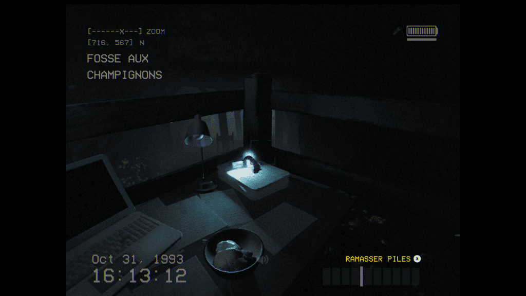 Pour ce qui est de la lumière de votre caméra, vous devrez régulièrement récupérer des piles, disséminées un peu partout dans la forêt. Encore faut-il réussir à les trouver avant que votre caméra ne s’éteigne complètement. Heureusement, vous n’êtes pas totalement livré au hasard. Une flèche apparaît sur le côté gauche pour vous indiquer des points importants dans la forêt. Elle peut notamment vous guider vers des zones où trouver des piles, ce qui augmente un peu vos chances de garder votre caméra allumée… et donc de survivre un peu plus longtemps. Pour finir, sachez qu’il n’est pas possible de cumuler plusieurs piles sur vous.