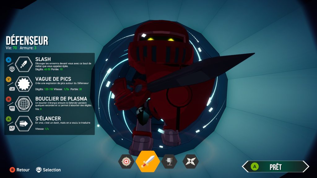 Il découpe les ennemis avec son épée, lance des pics en arme secondaire et dispose d’un bouclier comme gadget pour se protéger.