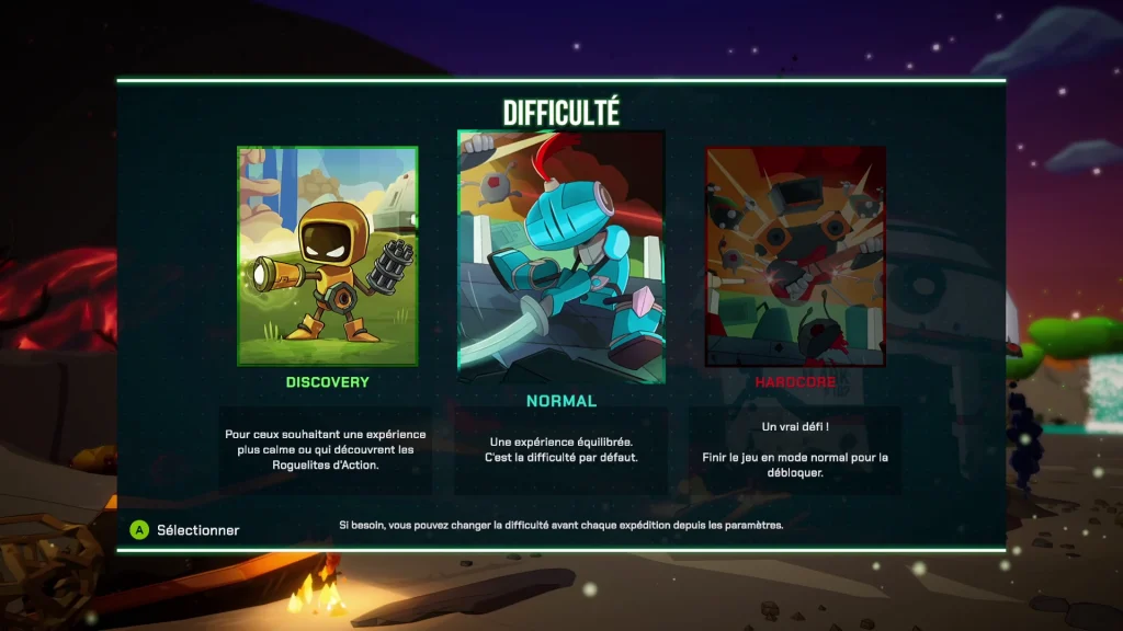 D’après le menu du jeu, il est possible de modifier la difficulté avant chaque expédition depuis les paramètres. Toutefois, lors de mes sessions de jeu, je n’ai pas réussi à trouver cette option.