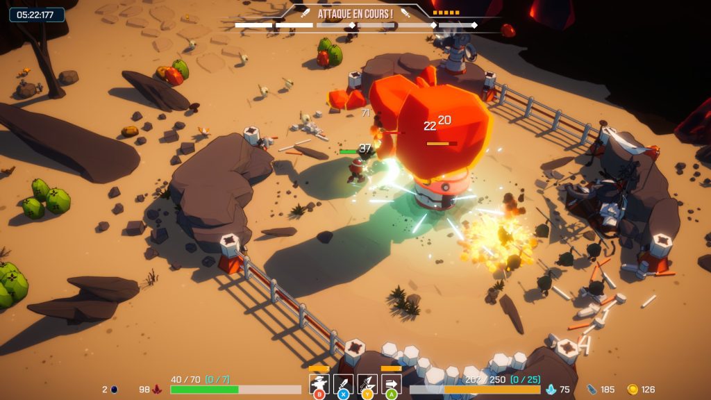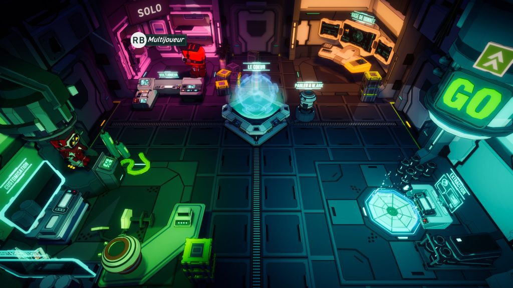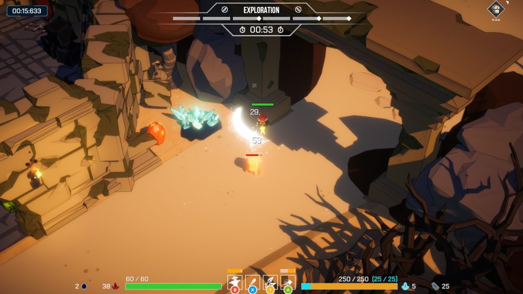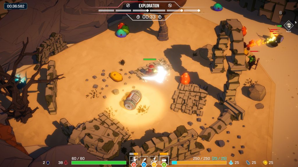 Lorsque vous lancez une partie, vous disposez d’un temps limité pour explorer la zone. Durant cette phase, vous pouvez récupérer différents composants : cristaux, objets d’amélioration pour votre personnage, mais aussi découvrir des bases ennemies contenant des coffres remplis de ressources.