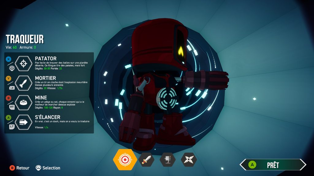 Vous incarnez donc un Kritter. Votre personnage peut se déplacer librement, effectuer un dash, tirer avec son arme principale, utiliser une arme secondaire ainsi qu’un gadget spécifique.