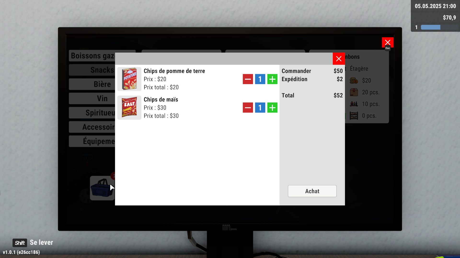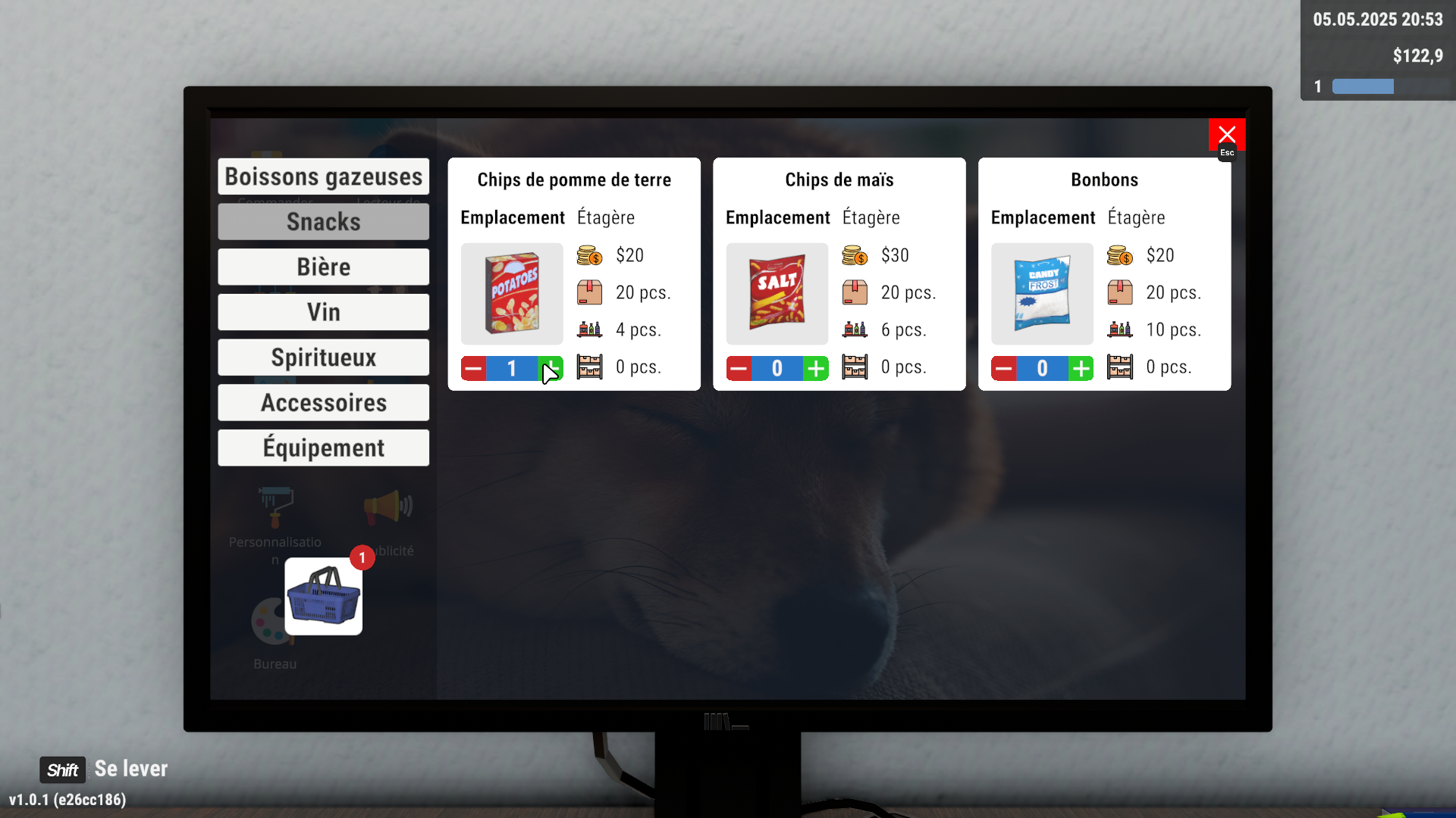 Comme dans tout bon jeu de simulation, vous aurez accès à un ordinateur qui vous permettra de gérer plusieurs options, telles que la banque ou encore les publicités (voir plus bas). Cependant, ce qui nous intéresse le plus ici, c’est la possibilité d’acheter vos marchandises. Il vous suffit de passer commande via l’ordinateur, et le camion de livraison arrivera automatiquement devant votre boutique.
