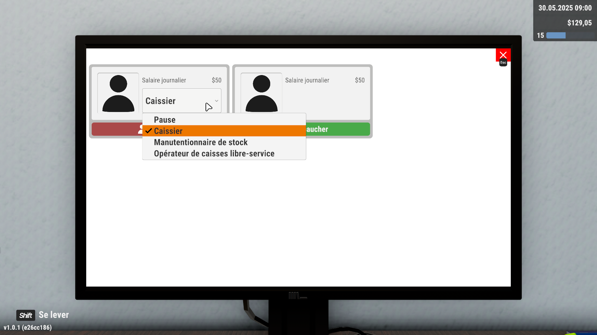 - Enfin, la troisième catégorie est dédiée aux Assistants. Elle regroupe tout ce qui concerne les employés. Il existe trois types de personnel : les caissiers, ceux qui gèrent le stock, et ceux qui s’occupent des opérations liées aux caisses libre-service. Vous les rémunérez chaque jour et avez la possibilité de les licencier à tout moment.