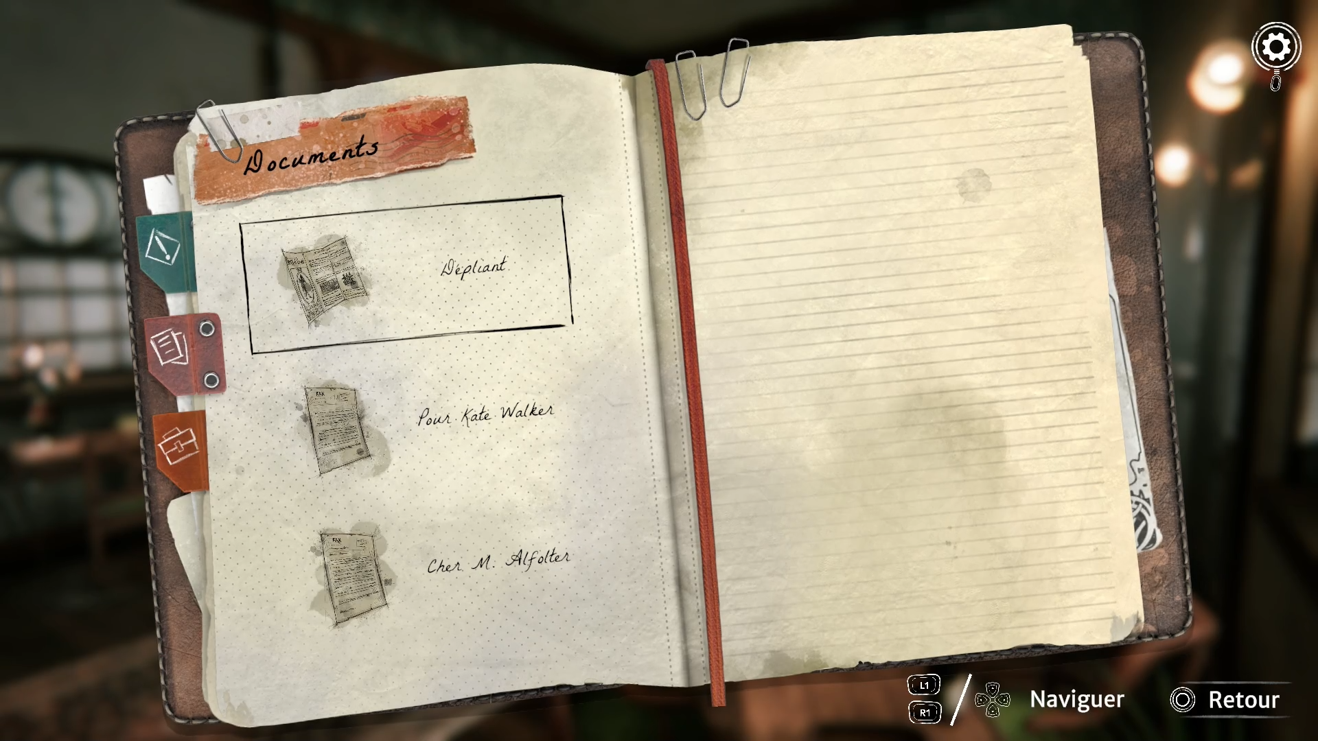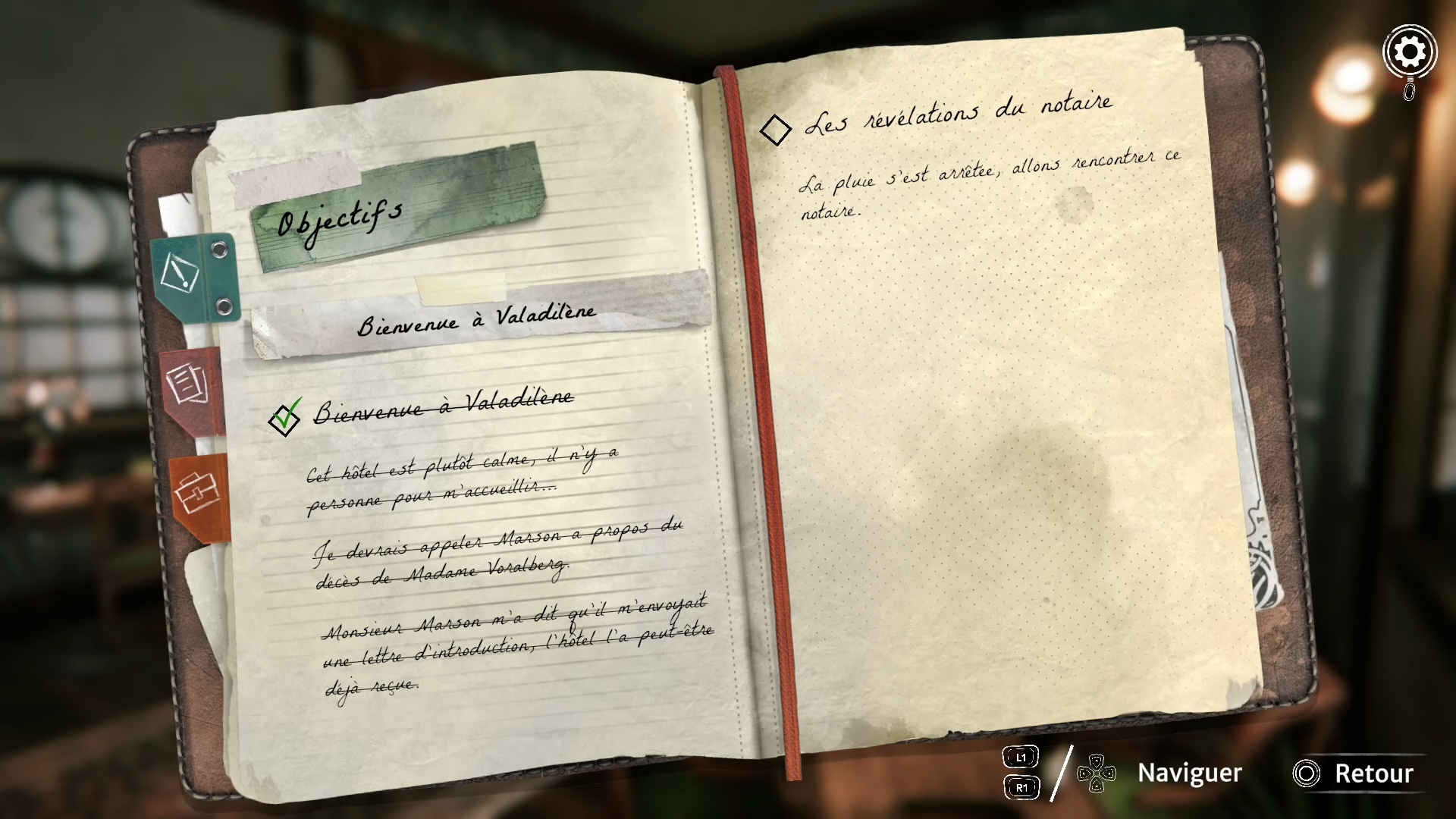 La dernière aide du jeu est le carnet de Kate. Dans ce dernier, on retrouve tous les objectifs en cours. En cas de problème, si on se retrouve bloqué dans l’intrigue, cette aide vous expliquera clairement ce qu’il faut faire.