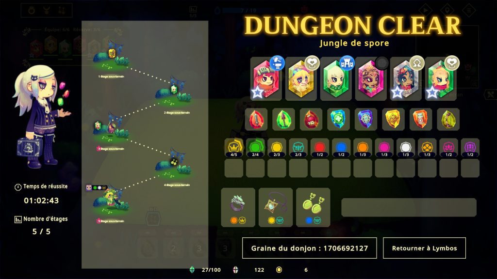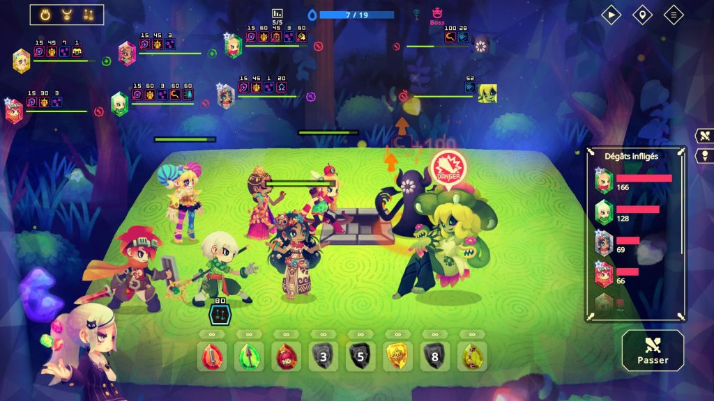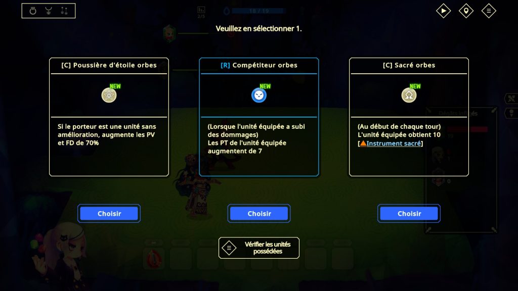 Lorsque vous descendez d’étage, vous obtenez des récompenses comme des sorts de protection, des équipements, de nouvelles unités ou des carats, qui permettent d’acheter des emplacements supplémentaires pour vos unités ou d’en recruter de nouvelles.