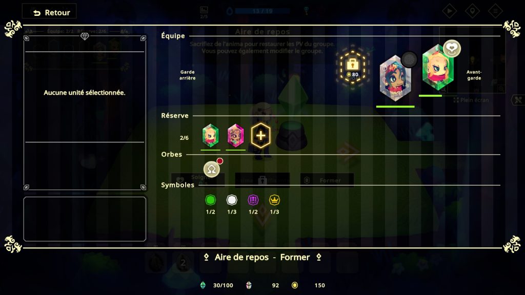 Pour équiper et améliorer vos unités, vous devrez trouver une salle de repos ou la bijouterie. Ce sont les seuls endroits du donjon où vous pourrez organiser votre équipe. Dans la salle de repos, si vous avez assez de gemmes, vous pourrez vous soigner ainsi que vos unités.
