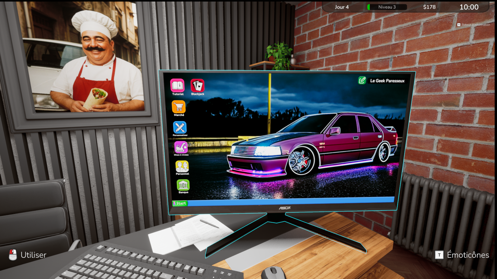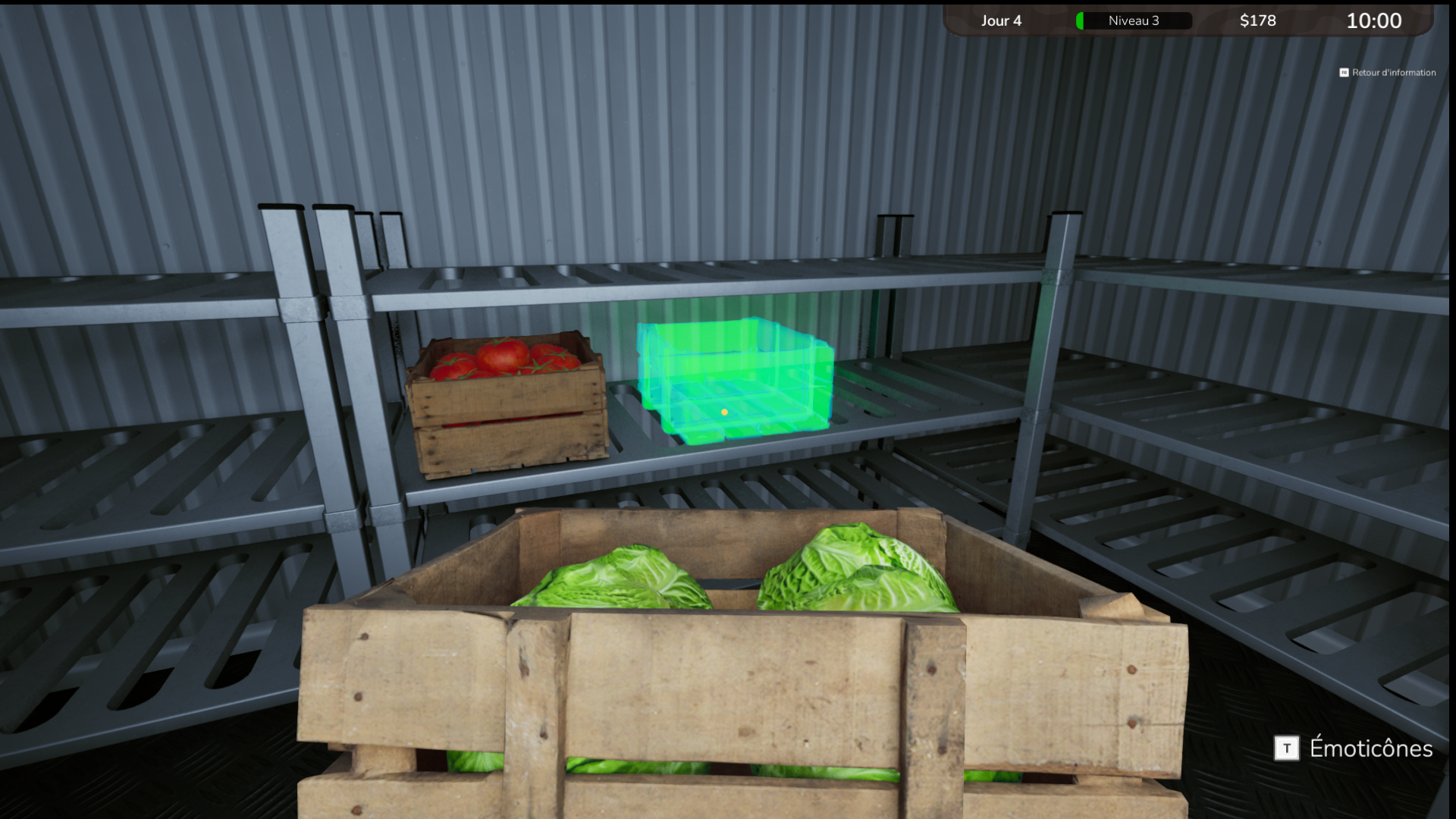 Pour cela, direction le bureau, où se trouve votre ordinateur. Approchez-vous et interagissez avec lui pour accéder au marché. C’est directement via cet ordinateur que vous pourrez passer votre toute première commande (et pas seulement). Au programme de cette première commande : viande, salade, wrap. Difficile de vous tromper puisqu’il s’agit des seuls ingrédients disponibles.