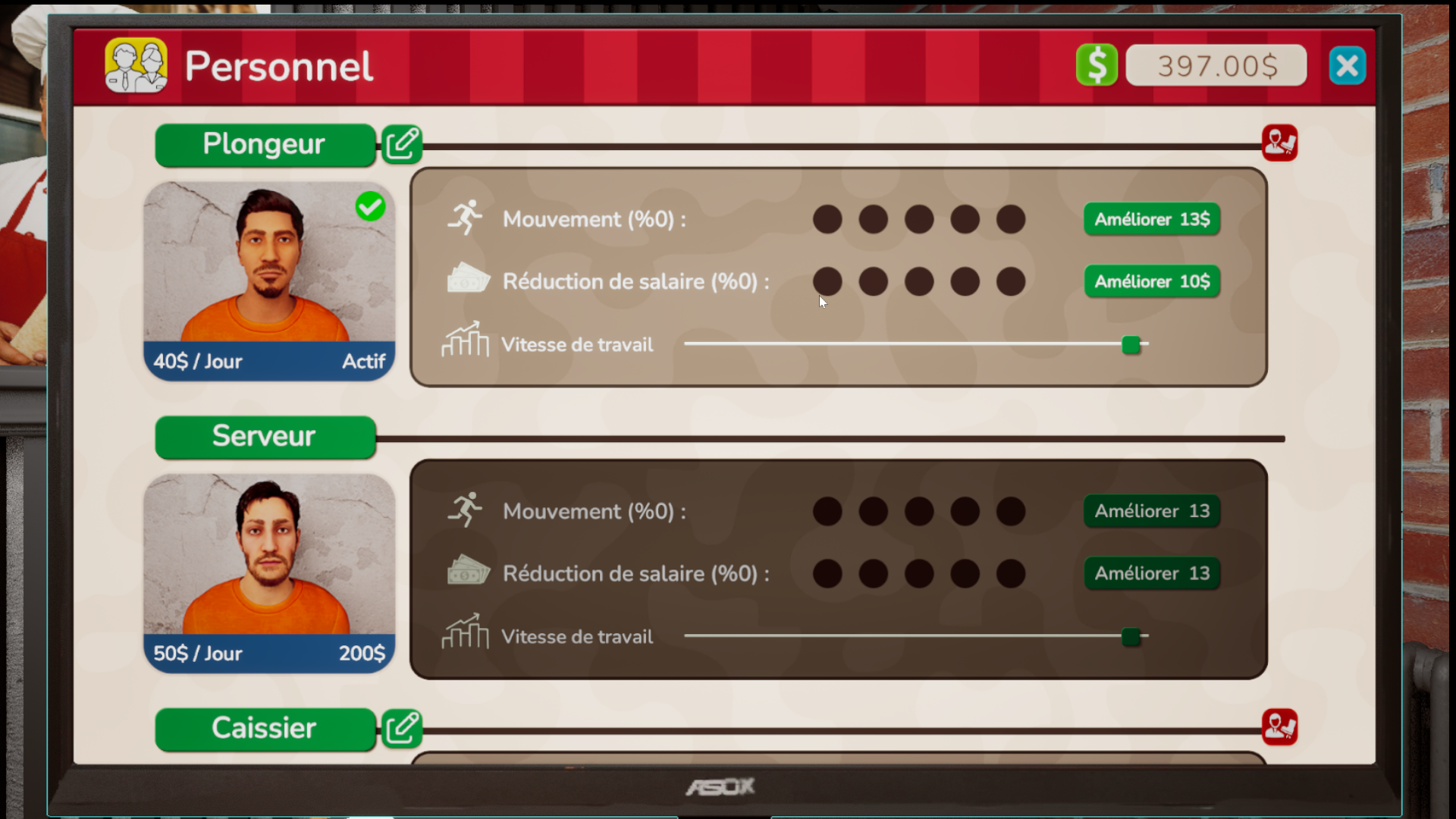 En mode solo, vous aurez rapidement la possibilité d’obtenir de l’aide précieuse, moyennant un salaire à verser. Plusieurs types d’employés sont disponibles pour vous assister dans la gestion de votre restaurant. Il est possible de consulter le nom de chaque employé, de le renvoyer à tout moment, puis de le réembaucher selon vos besoins.